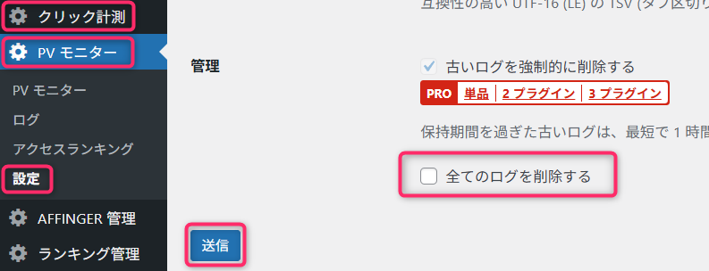 「全てのログを削除する」のチェックボックスにチェックを入れて「送信」をクリックします。