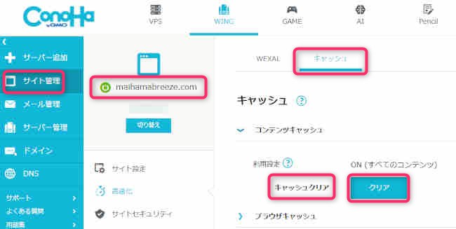 以下は当サイトのあるレンタルサーバ、ConoHa WINGにおけるキャッシュクリアである、コンテンツキャッシュのクリア手順について記録します。