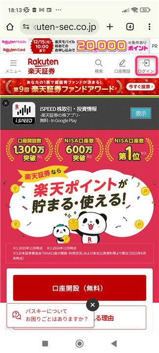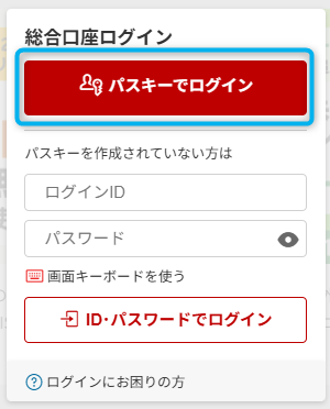 そして、楽天証券WEBサイトにアクセスします。「総合口座ログイン」欄の「パスキーでログイン」をクリックします。
