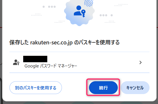 「保存したrakuten-sec.co.jpのパスキーを使用する」というポップアップが出ますので確認の上「続行」を押下します。