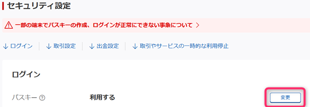 「ログイン」欄の一番上に「パスキー」欄が表示されていて「利用する」となっているはずです。右に「変更」ボタンがありますのでこれを押下します。