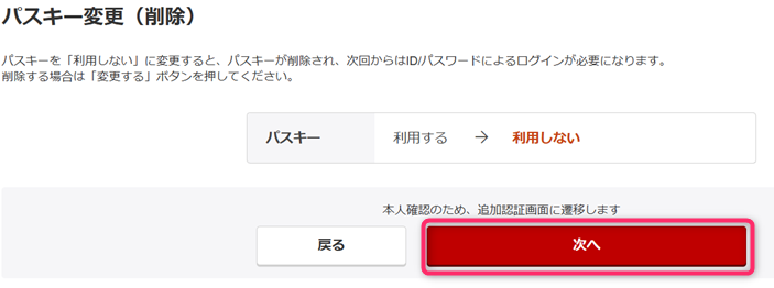 「パスキー変更(削除)」画面が表示されます。「次へ」を押下します。