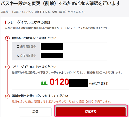 「パスキー設定を変更(削除)するためご本人確認を行います。」画面が表示されます。