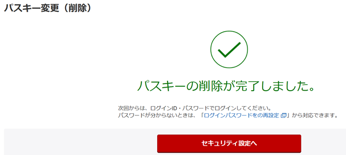 「パスキーの削除が完了しました」と表示が出れば、パスキーの設定が「利用しない」に変更されたことになります。