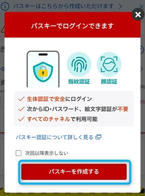 ログインすると「パスキーでログインできます」というポップアップが上がってきたので、「パスキーを作成する」という赤いボタンを押します。