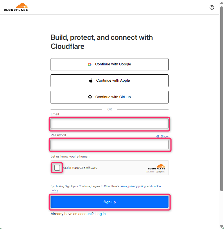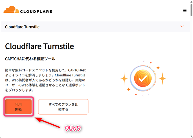 Google eCAPTCHAの利用時と同じように、Cloudflare Trunstileを利用するには、Cloudflareにアカウントを作成します。