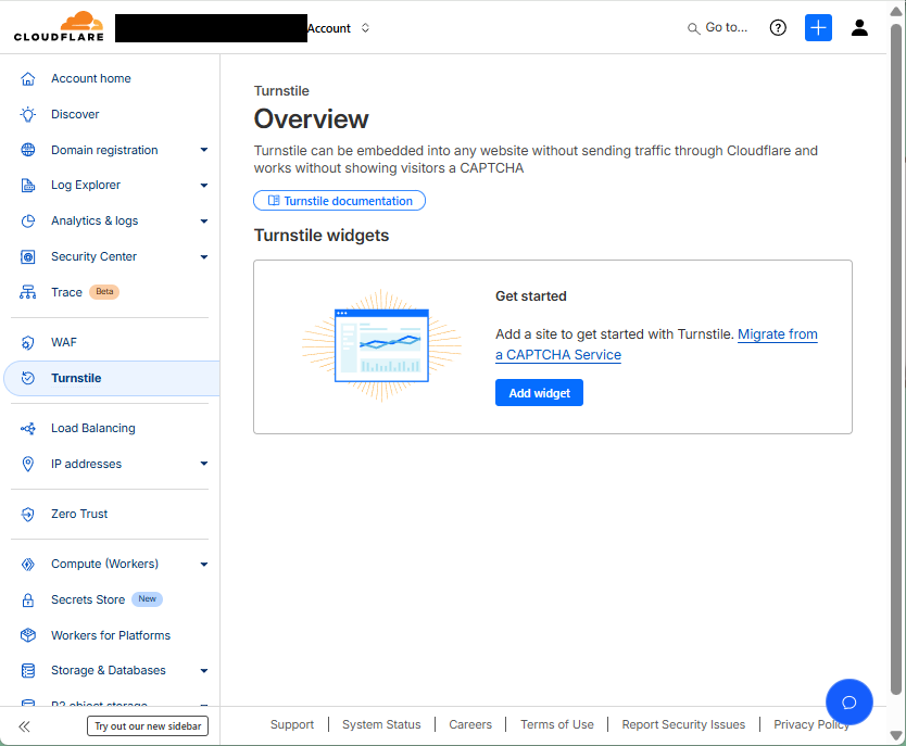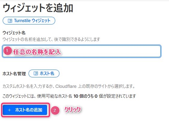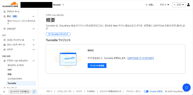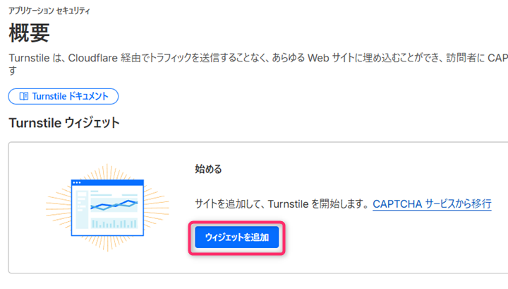 概要欄のTurnstileウィジェットの囲みの中にある「ウィジェットを追加」をクリックします。