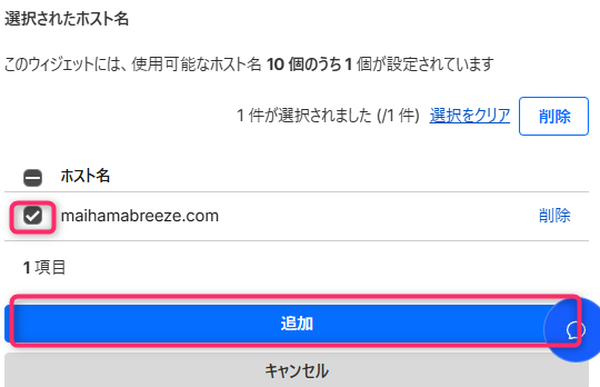 追加されたホスト名欄に「maihamabreeze.com」があることを確認、チェック入れて、「追加」ボタンを押下します。