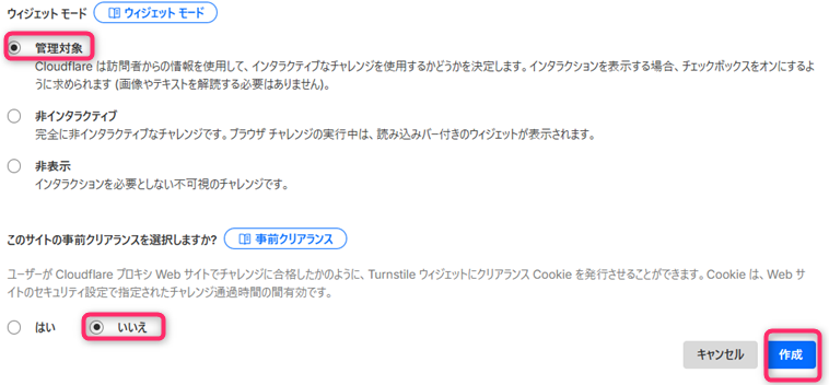 ウィジェットモード欄に細かい設定が出てきますが、此処は「管理対象」を、「このサイトの事前クリアランスを選択しますか」欄は「いいえ」を選択します。指定出来たら「作成」クリックします。