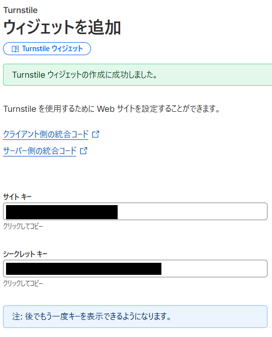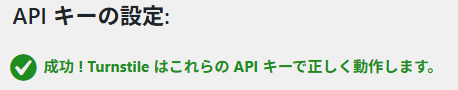 「成功! TrunstileはこれらのAPIきーで正しく動作します。」と表示されます。