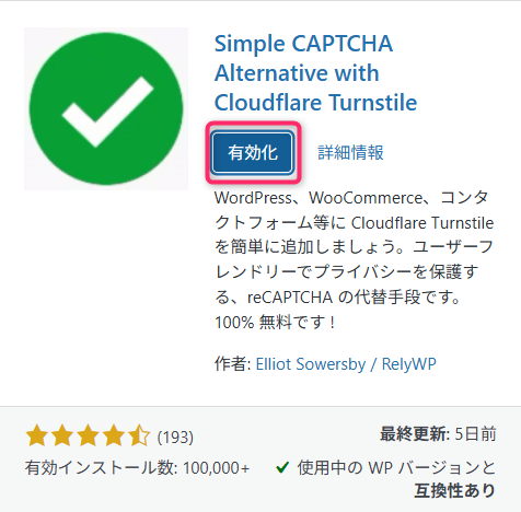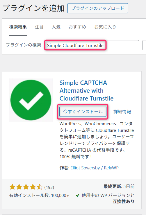 検索結果から、「Simple CAPTCHA Alternative with Cloudflare Turnstile」、「作者:Eliot Sowersby / RelyWP」を見つけて、「今すぐインストール」をクリックします。