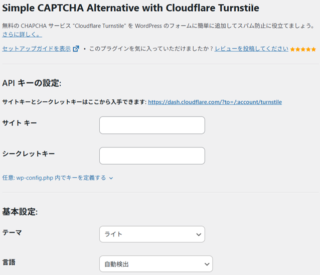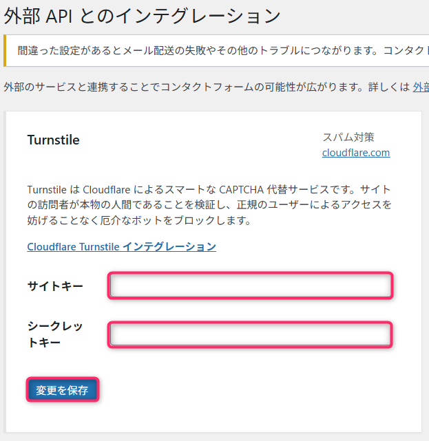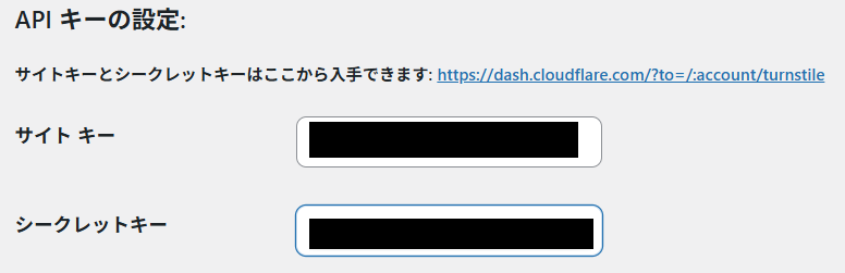 APIキーの設定欄のサイトキーとシークレットキー欄に先ほど「Turnstileウィジェットの作成」の項で作成して放置した画面に掲載されているサイトキーとシークレットキーをコピペします。