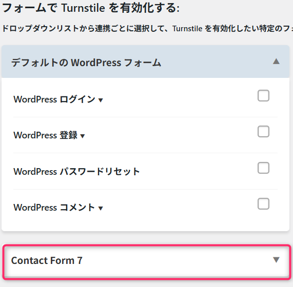 この画面を下にスクロールすると「フォームでTrunstileを有効化する」欄にContact Form 7のプルダウンがありますので開きます。