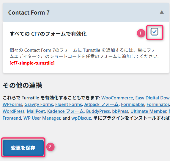 「すべてのCF7のフォームで有効化」横のチェックボックスにチェックを入れ、「変更を保存」ボタンを押下します。