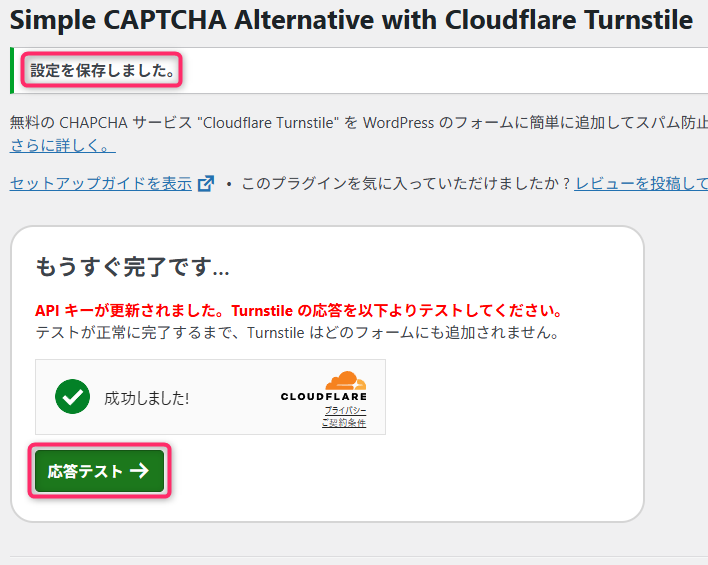 「設定を保存しました」と表示され、Turnstile欄の下の方に「Turnstileはこのサイト上で有効化されています。」と表示されていればOKです。
