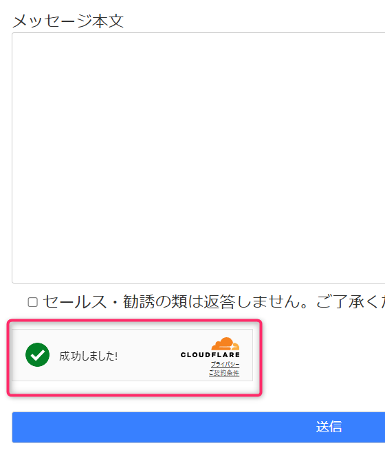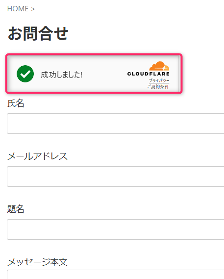 確認のため、フォーム画面を開いて確認します。問題なければ下の画像のようにCLOUDFLAREのシールが表示されているはずです。