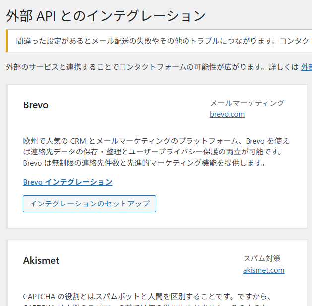 WordPressダッシュボードに入り、左メニューに「お問い合わせ」下の「インテグレーション」をクリックして、「外部APIとのインテグレーション」を表示させます。