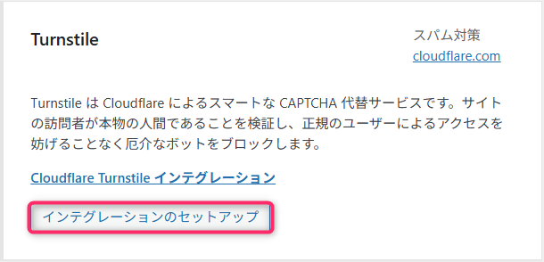 スクロールして、Turnstileの項を表示させ、「インテグレーションのセットアップ」をクリックします。