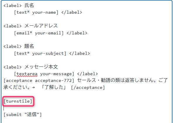 Contact Form 7のフォームでTurnstileシールを表示させたい場所に[turnstile]ショートコードを挿入します。