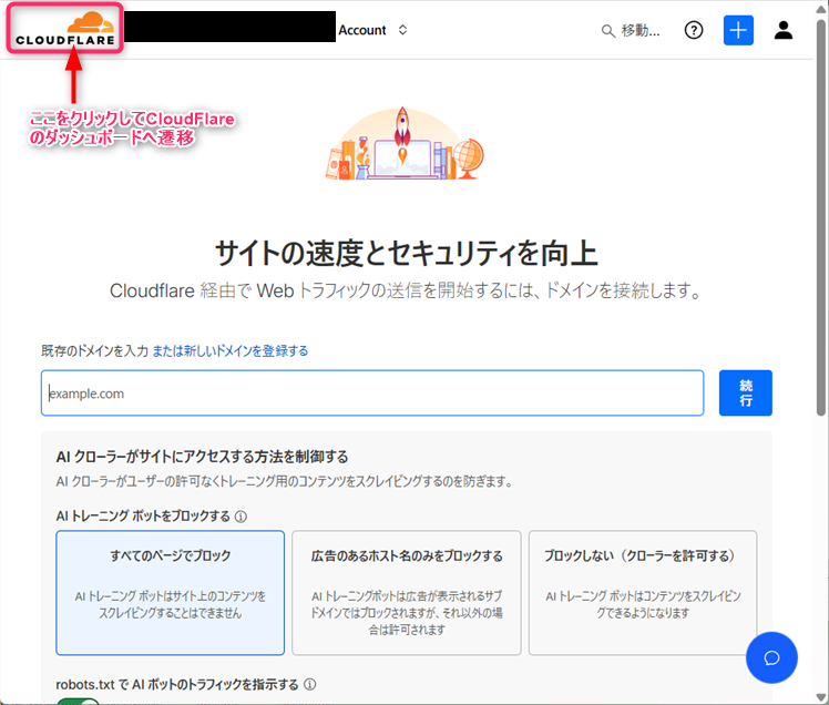 左上のロゴマークをクリックしてCloudflareのダッシュボードに遷移します。