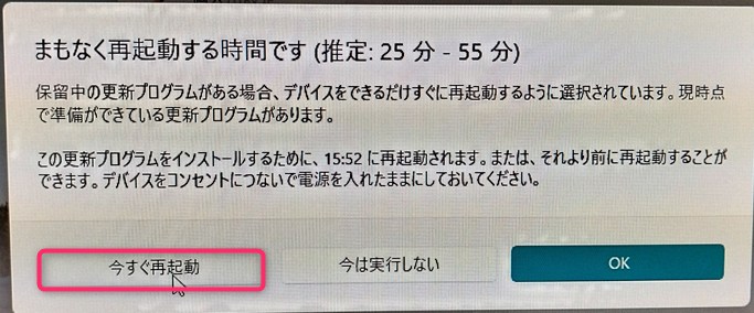 終了すると以下のダイアログが表示されます。「今すぐ再起動」をクリックします。