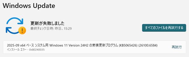 WindowsUpdateでKB5065426(26100.6584)がインストール失敗してから、正常にインストールされるまでの作業について記録します。