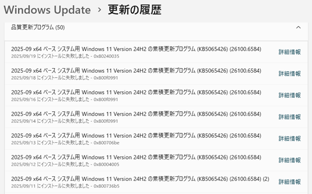 KB5065426(26100.6584)がインストール失敗したときのメッセージ計7回分の詳細