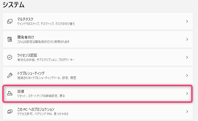 「スタート」→「設定」→「システム」で「回復」を選択します。