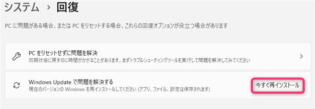 「回復」画面で「Windows Updateで問題を解決する」欄の「今すぐインストール」をクリックします。
