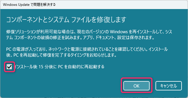 以下のダイアログが表示されますので、「インストール後15分後にPCを自動的に再起動する」欄のチェックボックスにチェックを入れ、「OK」をクリックします。