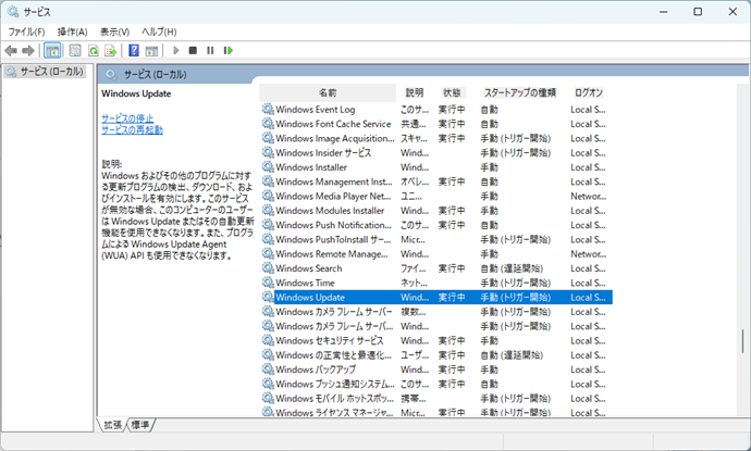 「サービス」パネルを呼び出します。スクロールして「WindowsUpdate」というサービス名をみつけて、アクティブにします。
