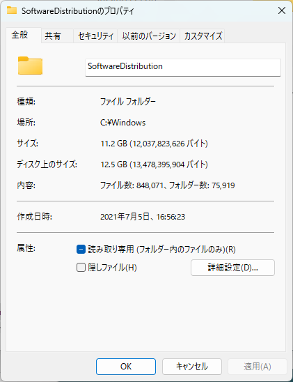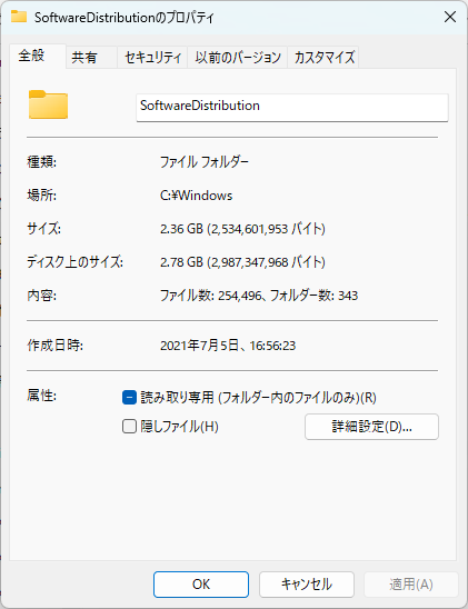 削除作業終了後、SoftwareDistributionのプロパティーを見ると画像の様に2.78GBと10GB程