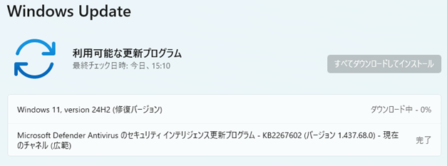 WindowsUpdate画面が表示され「Windows11 wersion24H2(修復バージョン)のダウンロードが開始され、インストールされます。