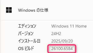 OSのビルドが「26100.6584」となっていることを確認します。